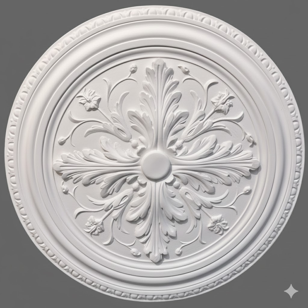 Elevate your interior with our exquisite, oversized fibrous plaster ceiling rose – a true masterpiece of craftsmanship. This stunning architectural element is meticulously handcrafted using traditional techniques, resulting in a ceiling centerpiece that exudes timeless elegance and grandeur.